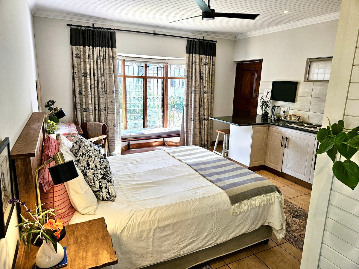Baobab Self-Catering Suite can accommodate 2 people. Discover tranquility in our Baobab Suite, perfect for any traveller. Enjoy a private entrance, open-plan living area, full kitchen, workstation, and free WiFi. Unwind in the modern bedroom with a queen size bed and en-suite bathroom. The suite boasts views of lush gardens and a beautiful pool. Includes free parking and a Smart TV. Close to attractions, dining, nature reserves, and shopping. Ideal for relaxation or a productive stay.