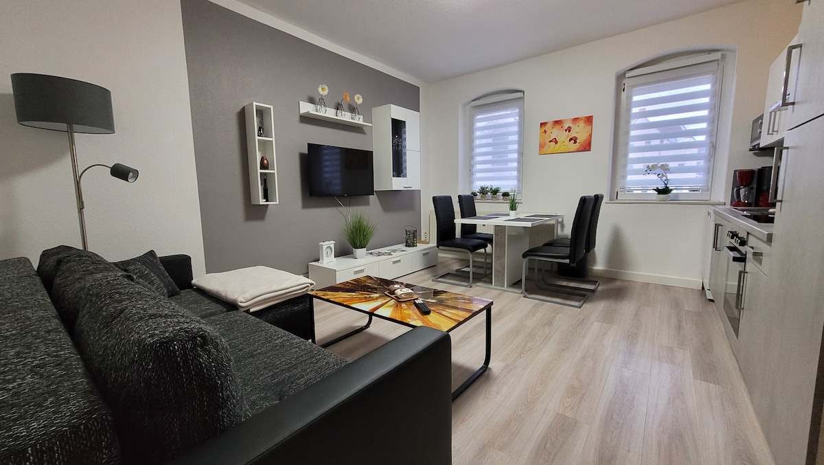 EDLER WOHNRAUM Your perfect stay in Zwickau awaits! Central location, modern amenities – and you check in flexibly with self-check-in. Expect a stylish apartment with a fully equipped kitchen, a high-quality living area, and a luxurious bathroom with a walk-in shower. Sleep soundly in the comfortable canopy bed (180x200 cm) or on the extendable leather sofa bed. Enjoy the air conditioning, fast Wi-Fi, and the balcony with city views. Free parking on the opposite street side is available.