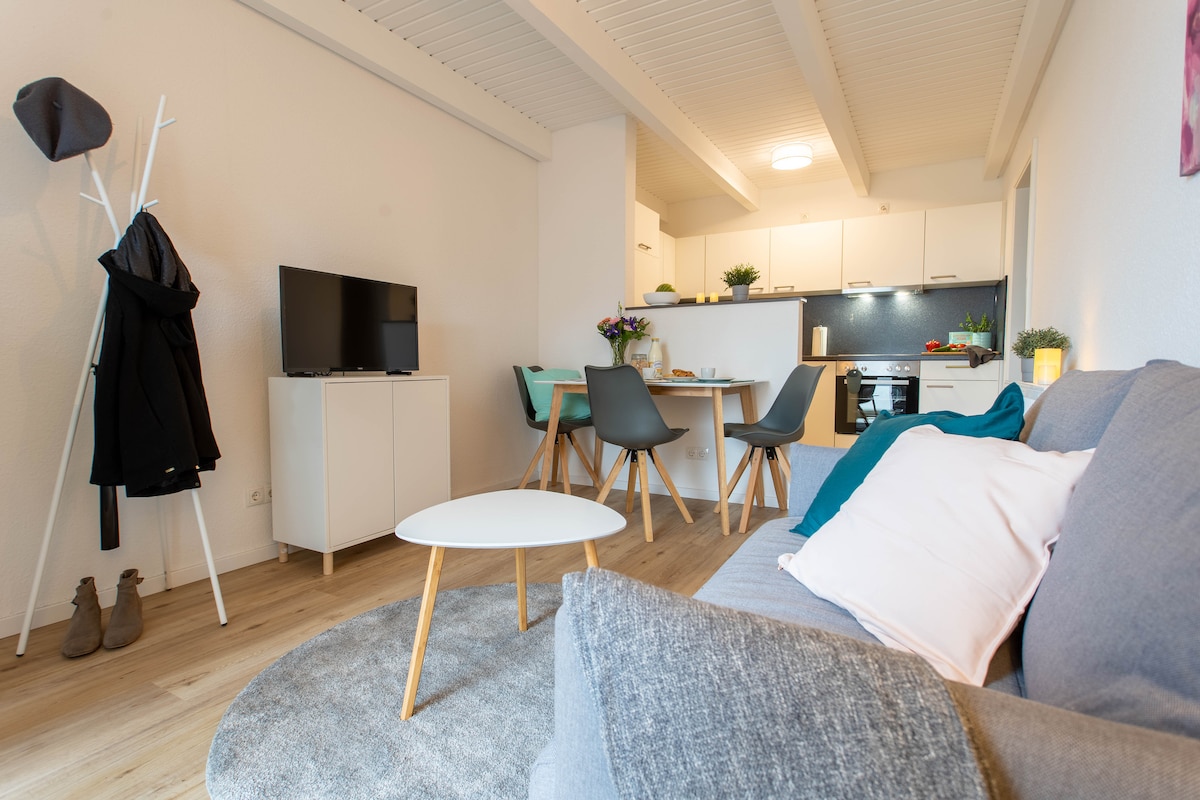 Unser kleines aber feines Ferienapartment Ekern ist modern eingerichtet und bietet Platz für zwei Personen. Die offene, voll ausgestattete Küche fügt sich perfekt in den Wohnbereich ein. Das moderne Badezimmer liegt direkt am Schlafzimmer mit gemütlichen Doppelboxspringbetten. Eine feste Terrasse hat dieses Apartment nicht. * Hunde gestattet, 5,00 € täglich.