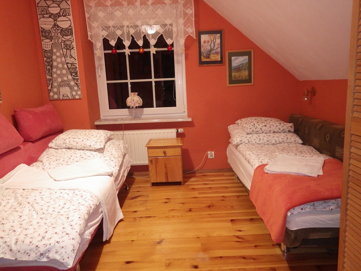 This wooden lodge is set among a beautiful scenery of Beskid Maly mountains in a lower Selisian part of Poland. It is situated between the tree lines in the middle of the woods so dear and other wildlife can often be observed on the meadow passing by on their way to the stream. This area is particularly favored by nature lovers with great hikes,mountain climbs , bike rides, fishing, horse ridding even paragliding all near by. Only 1 h drive from city of Krakow and the airport.