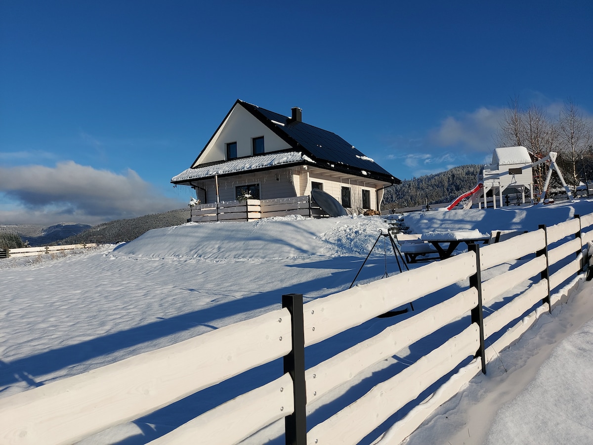 Bajkowa chatka na wysokości 850 m n.p.m. z malowniczym widokiem na pobliskie góry. Domek ma powierzchnie 50 metrów kwadratowych. Na parterze znajduje się salon z kominkiem, kuchnia z aneksem jadalni oraz łazienka. Na piętrze na antresoli znajduje się duże podwójne łóżko i kanapa. W domku są dwa telewizory. Domek jest dla 2 osób. W obiekcie jest dostępny internet STARLINK. Proszę o zapoznanie się z Regulaminem domku. Oferta dotyczy ceny za domek. Cennik atrakcji jest zawarty w regulaminie.
